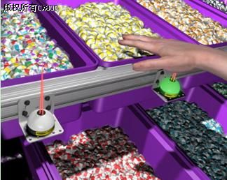顺序拾取应用: 在一个执行零部件生产的程序中,先在相应的取货箱上安装EZ-LIGHT指示灯,并且将传感器的信号连接到后端处理控制器上,从而可以通过信号指示的方式,指导操作者正确的取货顺序。EZ-LIGHT可以按顺序,显示不同的颜色,从而指示现场的人员应该从哪个取货箱内拿货。当工人手伸到货箱内取货时,EZ-LIGHT可以检测到信号,并将信号反馈到控制器,控制器会根据顺序的要求出发下一个货箱上的EZ-LIGHT发出信号。