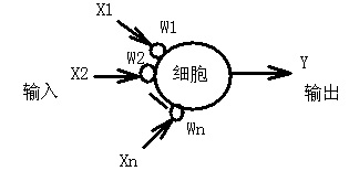 神经网络是模拟生物的神经系统(特别是脑)功能的网络。人脑约由150亿个神经细胞组成,每个细胞同数千、数万个神经细胞相联系,形成网络。这样,神经细胞模型可以看作是n输入单输出的信息处理单元。某个输入Xi对神经细胞的影响以影响度表示,称为细胞的结合权重或效率Wi,这个细包模型如图1所示。