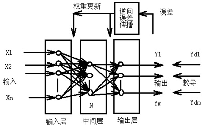 目前逆向误差传播学习法得到广泛应用,这一学习法以输出的二乘误差为评价函数,以最速下降法反向修正各层结合权和阀值。