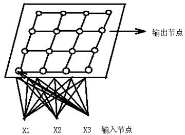 图3所示M个输出节点的阵列,用来抽取输入特征,输出节点用局部连接相连。每一输入xi通过可变的权重wij与每一输出节点yj相连。反复送入分类数据作为输入向量x,权重将进行组织,以输出最大的节点为核心,使核的节点和其邻近的节点响应相同的输入信号。通过这种学习,使各节点的权重代表相应的输入模式。与逆向误差传播多层神经网络不同的是:这里是由学习自动抽取数据的特征,分成典型的模式,而不用给定期望的模式:而分成的典型模式用权重记忆,找出权重就掌握了数据的特征。图3为自组织网络图。