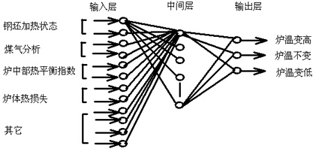 采用多层感知器神经网络作为轧钢加热炉炉温控制和热风量控制专家系统的一部分。 以轧钢加热炉炉温预测神经网络为例,采用如图4所示的三层网络。以钢坯加热状况,煤气成分,炉中部热平衡计算求得的计算值指数、 炉体热损失量过程数据作为输入层的输入。