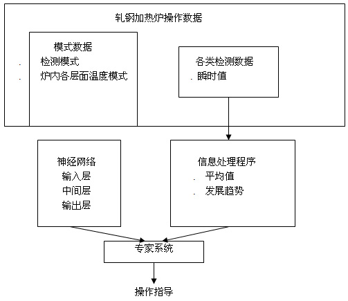 神经网络与专家系统的结合如图5所示。神经网络用C语言编写程序,起动后,读入数据,在几个煤气流分布模式中,取最接近的作为判定结果,送入专家系统。专家系统根据模式识别的输出和信息处理的输出,使用预先装入的规则,经过推理机进行推理,预测轧钢加热炉炉况,输出操作指导。