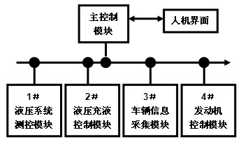 图如下图2所示,控制系统采用分布式控制,共有5个节点控制器,主要分布在车上控制量和采集量密集的地方,包括主控制模块、液压系统测控模块、液压充液控制模块、车辆信息采集模块以及发动机控制模块。