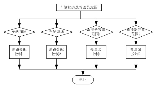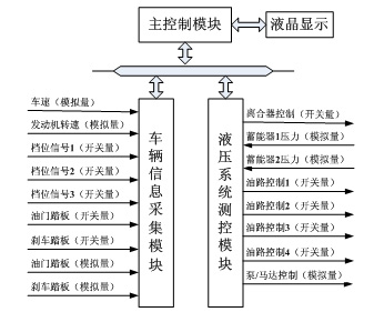 如上图3所示,车辆信息采集模块采集车速、发动机转速、档位信号(前进、空档、倒车)、油门踏板及刹车踏板的状态及幅度。液压系统测控模块采集蓄能器的压力,控制离合器的吸合与断开,通过油路控制(4个开关量)实现油路分配控制,最后通过液压泵/马达控制实现液压系统回收/释放功能及强度。
