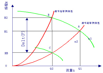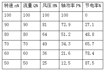 ![]() 图3-1 风机的运行曲线 当所需风量从Q1减小到Q2时,如果采用调节风门的办法,管网阻力将会增加,管网特性曲线上移,系统的运行工况点从A点变到新的运行工况点B点运行,所需轴功率P2与面积H2×Q2成正比;如果采用调速控制方式,风机转速由n1下降到n2,其管网特性并不发生改变,但风机的特性曲线将下移,因此其运行工况点由A点移至C点。此时所需轴功率P3与面积HB×Q2成正比。从理论上分析,所节约的轴功率Delt(P)与(H2-HB)×(C-B)的面积成正比。 考虑减速后效率下降和调速装置的附加损耗,通过实践的统计,风机类通过调速控制可节能达20%~50%。 2.2变频改造节能分析 改造前工频运行功率计算公式 其中: U——电机电压,kV; I——电机电流,A; P1——单一负荷下工频运行功率, kW; 其中: T——全年平均运行时间,h; P1——单一负荷下的运行功率,kW; δ——这种负荷下的全年运行时间比例; C1——改造前总耗电量,kW·h。 改造后变频运行预计功率计算公式: 利用公式: 其中: P1——工频运行功率,KW; P额——额定轴功率,KW; 根据改造风量不变的原则,有Q1-Q2,其中Q2为改造后的风量。所以 其中C2——改造后总耗电量,kW·h。 2.3节能对照表:风机、水泵变频调速时的能耗比较