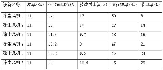 ![]() 上述均为百分比,100%流量为风机的额定流量,100%功率为工频额定工况运行时消耗功率(即电机输入功率 = 风机额定轴功率/电机效率,电机效率一般为93-96%,额定功率较大者效率较高)。变频调速时的节能量即为两种调节方式的能耗差值(百分比乘额定消耗功率)。 2.4 破碎除尘风机技改前后能耗对照表