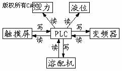 本系统对溶配机采用了PLC直接控制,这样既减少了电气元器件又简化线路,同时还通过触摸屏把相关的过程变量准确及时地显示出来,供值班人员作参考之用。为了能够准确地控制投加量,采用变频器控制螺杆泵来实现投加量的线性可调,同时对频率的设置及一些相关量的控制就是通过触摸屏在现场来实现。系统的部分网络结构如图2。