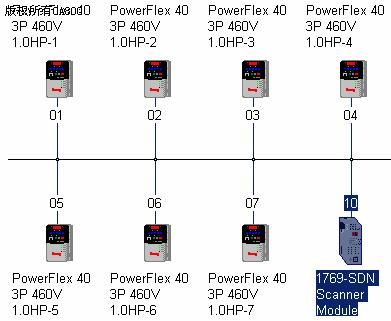 变频器选用A-B PowerFlex变频器家族中尺寸最小并且效率最高的PowerFlex40交流变频器。PowerFlex40具有强大的通讯功能,只要配置不同的通讯卡就可以能组成DeviceNet、EtherNet/IP、Profibus网络,本系统就是选用22-COMM-D通讯卡来组成DeviceNet网络。同时,因为PLC选用的是MicroLogix 1500,所以在通讯模块上选用DeviceNet扫描模块1769-SDN来配置DeviceNet网络。