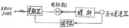 压力变送器安装于螺杆出口处,它将溶体压力转换为电信号送至调节器,该调节器由CPU微处理器等组成数字式调节器,压力信号(电流信号)在调节器中与压力设定值进行比较,若其差值为零,则调节器输出信号不变,变频器输出频率不变,若比较后的差值信号为正或负,则调节器将对偏差信号进行PID运算后输出,调节变频器输出频率和螺杆转速,使熔体压力维持不变。