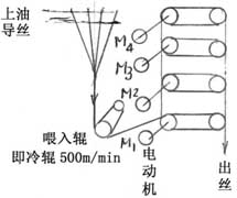 热辊必须与另一与之配合的转动辊一起使用,以达到导丝功能,该辊可以是主动的、完全相同的热辊,也可以是被动的、不加热的分丝辊,一般采用后者。丝束通过喂入辊喂至低速热辊(即第一对热辊),然后再导入高速热辊(第2-4对热辊)。如图3所示。