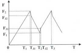 由图可见,当变频器驱动横动电机达到上限频率或下限频率时,频率应突变,从F2下降到FJ2,从F1上升到FJ1,突变频率(F2—FJ2)或(FJ1—F1)幅值一般为基本频率F1的1%左右,突变频率的时间,理论上要求是0,但实际上,由于横动装置和电机有惯性,使得电机速度不可能突变而有一过渡时间(TJ1—T1)或(TJ2—T2),该过渡时间通常在0.1s以上。