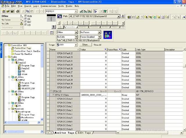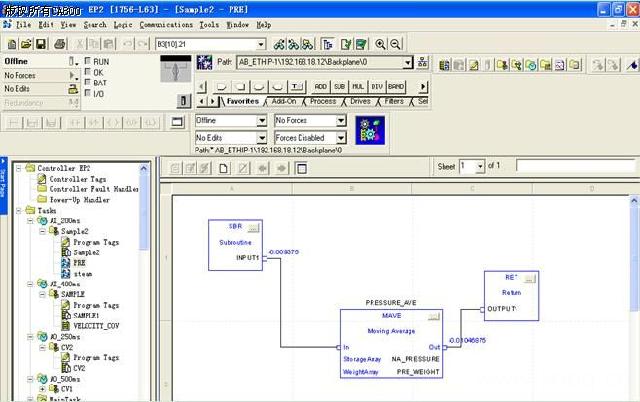 硬件和网络配置都下载完成之后就是编辑程序了, Rockwell software提供的Rslogix5000编程软件还拥有强大的离线编程能力,可以脱离I/O就可以把设想的程序先行完成,然后在现场将实际输入、输出对应起来就可以了。完备的数据处理,友好的编程界面,可以让程序工程师充分满足设备工作要求,保障在制品烟丝的质量的控制要求,而且Rslogix5000还提供了梯形图、功能图、顺序功能图、结构文本等多种编程方式,实现了没有做不到的只有想不到的编程创意空间。图14为Rslogix5000的编程界面: