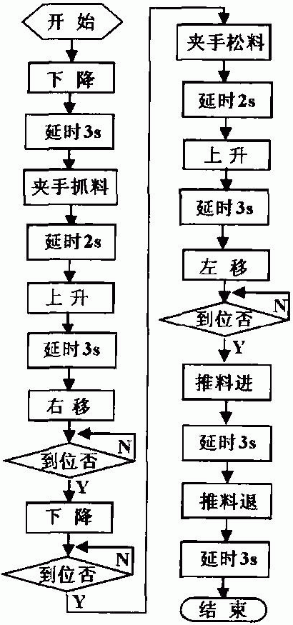 物料搬运系统实现的动作:下降→抓料→上升→右移→再下降→松料→再上升→左移→推料进→推料退。