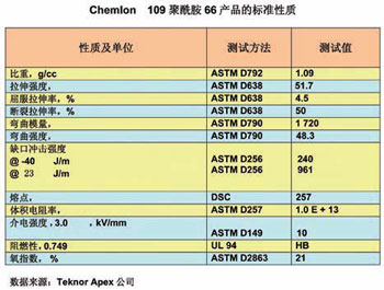 据介绍,Chemlon 109材料已达到了克莱斯勒、福特和通用汽车的车用材料标准,并已被用于生产这三大汽车公司使用的零部件。