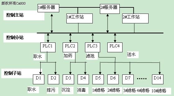 图1 水厂的处理工艺流程 为保证供水系统的安全可靠运行,达到优质供水节能降耗的目的,本文基于国内华南地区某大型水厂的实例,结合上面水厂的处理工艺流程,提出了一套基于罗克韦尔自动化产品及系统的水厂自动控制系统。 2 系统阐述 按照通常水厂的工艺实践,我们将取水和排污放在同一个取水分站控制,而混凝、反应、沉淀和消毒放在加药分站控制,过滤在滤池分站控制,送水在送水分站控制。 2.1系统构成 控制系统(图2)采用PLC+PC的监控方式,设置一个中心控制室主站与4个PLC控制分站(取水分站、加药分站、滤池分站和送水分站),有的现场分站下还挂有控制子站。控制子站与现场分站之间通过DH485总线形式通讯,现场分站之间以及现场分站与中心控制室主站之间以ControlNet形式通讯,中心控制室内的各计算机则通过高速以太网通讯。现场设备的控制分为手动与自动两种控制方式:手动时PLC监测设备的运行状态;自动时,PLC监控设备的运行。在自动状态下,现场分站还具有本站与远控两种控制方式:当处于本站控制方式时,现场分站PLC可以监控设备的运行,而中心控制室只能监测设备的运行状态;当处于远程控制方式时,中心控制室可以监控设备的运行。