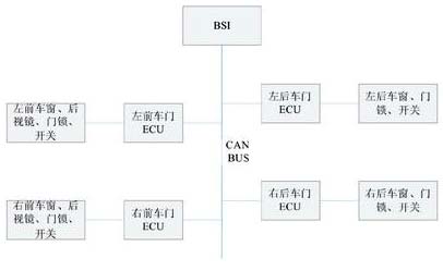车门控制系统采用总线式拓补结构,总线一般采用低速CAN总线或LIN总线,采用不同总线协议和不同的拓补结构可以提供不同程度的智能。第一种方案是每个车门采用一个集中控制的CAN节点,BSI和四个车门通过一个CAN网络连接,如图1所示。
