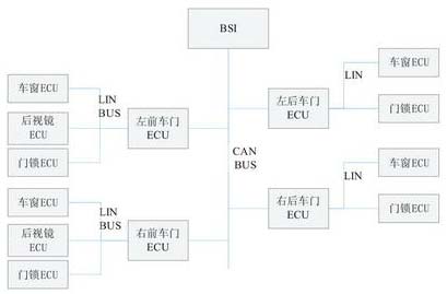 第二种方案是每个车门采用分布式LIN网结构,将各个功能做成单独的节点,即单独的后视镜控制节点,车窗控制节点,门锁控制节点,开关输入控制节点,该开关输入控制节点可以同时作为LIN的主节点,每个车门的主节点同时为CAN-LIN网关节点,BSI和四个车门通过CAN网连接。如图2所示。