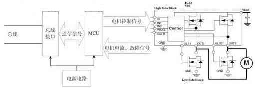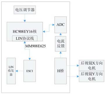 后视镜节点方案如下图所示,实现对后视镜上下、前后两个方向的位置调整,实现折叠功能和加热功能,采用飞思卡尔的智能分布式控制单芯片MM908E625实现,MM908E625是一个高度集成的单封装解决方案,在一个SOIC54的封装内集成了HC08内核和SmartMOS模拟控制IC,该模拟控制IC包括LIN物理层收发器,电压调整器,4个半H桥和一个高端开关,采用半H桥实现对后视镜电机的驱动从而实现位置调整和折叠,利用高端开关实现后视镜加热。