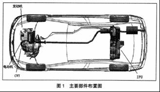 第四代IMA系统的主要部件有一个1.3-literi-VTEC 4-cylinder汽油机,一个高功率的超薄永磁同步电动机,一个无级变速器(CVT)和一个智能动力单元(IPU -Intelligent Power U-nit)。IPU由一个动力控制单元(PCU - Power con-trol Unit ),一组高性能镍氢电池和一个制冷单元组成。汽油机和电机布置在车的前部,智能动力单元布置在车的后部,具体结构如图1所示。