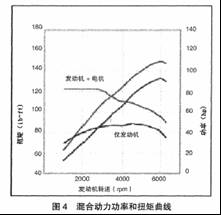IMA电机是一个3相超薄永磁同步电机,安装在发动机和CVT(无极变速器)之间,最大能够提供15KW的功率和139Nm的辅助力矩。电动机提供辅助推动力给发动机和在低速行驶状态下的电动机动力,也作为发电机在减速和制动时回收动能给电池充电。由于电机的辅助使整车的动力性得到了很大的提高,动力性曲线如图4所示。