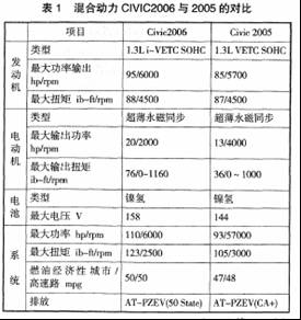 表1所示为搭载第四代IMA的civic2006与前代civic2005两种混合动力系统参数的对比。从与上代产品的对比中可以看出,主要部件选型未变,通过采用最新技术对发动机,电机和控制系统进行了改进,在减小各个部件空间的同时,增大了系统的动力性,使燃油和排放也有了很大的提高。