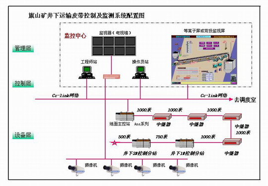 系统为实时监控网络结构,具备有完善的生产监控管理功能,对皮带运输主要环节及相关的辅助环节的生产过程进行实时数据采集、传输、处理、显示、记录打印,对井下运输皮带系统进行远程集中监控,同时配合工业电视系统进行安全图像监视,以确保人员及设备的安全。