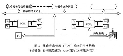 汽车底盘电子控制系统将逐步形成一个集成底盘管理(ICM)系统。该系统将集成所有的底盘电控子系统,实现各子系统问硬件、能量和信息的共享,以最大限度地获取系统集成带来的增效作用,提高汽车的安全性、舒适性和经济性。图3是ICM系统的层次结构,结构图的上层只包含了一些关键的监控功能,在这一层次上系统通过一个“协调器”ECU来实现对发动机、传动系、底盘系统等的管理。空白方块代表其他的功能,如导航和ACC功能。结构图的下层代表目前的电控系统,不过它 们不再是单独工作的模块,而是在上层单元监控、管理下协调工作。系统中的传感器和执行器可分为两类:传统型和智能型。传统型传感器和执行器与各自的ECU之间只有直接的物理连接,而智能传感器和执行器与ECU之间则使用总线接口来传输数据。一般情况下它们都具有自诊断能力和一定的传感器信号处理能力。