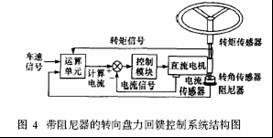 通过测量车速和转向盘转角,然后经过简单的微分运算可以得出转向盘力矩的大小。这样就可以利用一个力回馈电机向驾驶员施加应有的力,实现路感的要求。