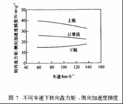 的关系如图7,根据路感的要求,转向盘力矩侧向加速度梯度不能小于15N·m/g,也不应过大,应在图7所示的上下限范围内[3]。由图7可见,利用转向盘转角计算力回馈电机的回正力大小可以满足路感要求。