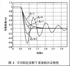 回正是转向盘转过一个角度后,撤去操舵力,车轮回到中位的过程,在这个过程中MS由一个初值突然变为零,在转向盘力回馈系统中,就是转向盘回到零位的情况。针对不同的阻尼系数,仿真结果如图8所示,从图中可看出增加阻尼可以减小回正时的振荡,当阻尼系数增加到1左右时,系统有较好的回正性能,振荡较小,同时回正速度较快。继续增大阻尼系数,将使回正速度下降。
