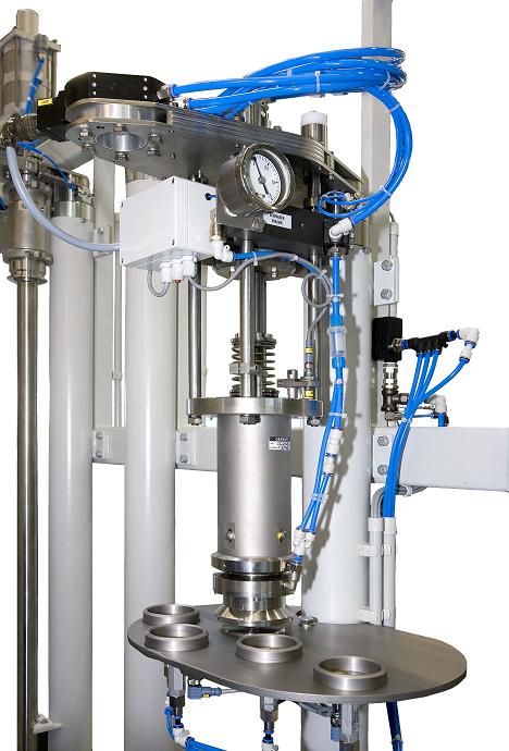 节臂机器人再次进行灌装头换型,调换上限位挡块,进行容器盖的铅封。制动鼓充满气后,托盘即被输送出去。