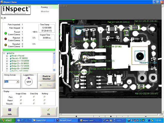定位设置允许被检测的PCB产品有小幅度的旋转,在X、Y轴上允许存在少量偏移。对于焊接处的检测,我们设置了4个线形的ROI(regionofinterested即感兴趣的区域)来判断是否焊接正确,并对这4个线形的ROI设置了标准偏差来控制其对具体变化产生的敏感度。注意:用平均灰度值去判断焊接处并不是很好的办法,因为如果被检测的区域很小,那么平均灰度值就显得不够灵敏了。最后,用4个矩形ROI的平均灰度值来检测另外的4个安装部位的组合部件是否安装到位。在这种情况下,对于这4个矩形ROI,平均灰度值对部件的安装到位和缺失十分敏感,因此可以做出准确判断。