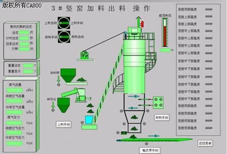 石灰窑生产的原料主要是石子(石灰石),成品是生石灰。在竖窑的加料口加入石灰石,经过煤气燃烧,煅烧成生石灰,输出到成品料仓。控制系统主要包括石灰石筛选、上料系统,煅烧系统,冷却空气循环系统,助燃空气循环系统,废气除尘循环系统,成品出窑、运输系统以及配套的煤气加压泵站、液压站。新建石灰窑工艺设计先进,自动化程度高,所有设备具备机旁手动、半自动、全自动三种控制模式,并具备设备故障诊断报警功能。