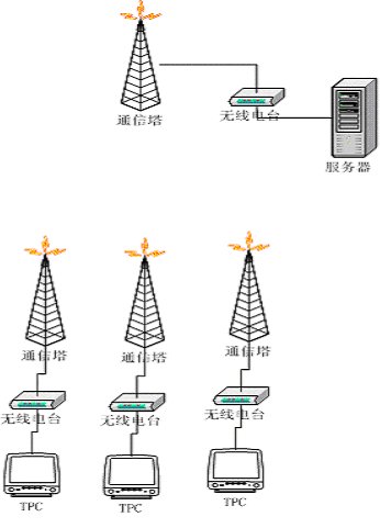 这里描述的主要是基于无线电台的无线通讯方案。在实际使用中,还可以考虑GPRS,无线网卡等方案。无线电台的优点是一次投资,无需运营费用,缺点是速率较低,还需要解决频点问题。