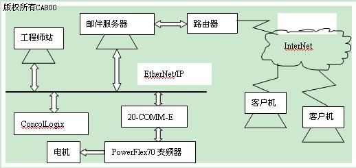 系统中主要硬件设备有变频器、邮件服务器、客户机、ControlLogix系统和工程师站。底层EtherNet/IP通讯网络和信息层通过路由连入InterNet,配合A-B公司RSLinx、RSLogix5000和Forward Mail Server软件实现系统组态编程和建立邮件服务器,系统中控制器采用最先进的高速处理器ControlLogix5555做底层逻辑控制处理完成相关的逻辑,通过自带的以太网通讯模块连入EtherNet/IP。变频器使用A-B公司的PowerFlex70作为被控对象通过20-COMM-E网络适配器连入Ethernet/IP,加之相应E-mail服务器客户端计算机组成完整系统,如图1系统结构框图所示。