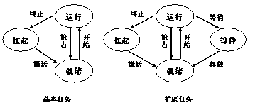 OSEK/VDX将任务分为基本任务和扩展任务。基本任务具有3种状态:运行状态、就绪状态、挂起状态;扩展任务比基本任务增加一个等待状态。基本任务只在开始和结束时才有同步点。扩展任务运行时可能进入等待状态,因此不仅在开始和结束有同步点,而且运行过程中可能有多个同步点。下图所示的是扩展任务与基本任务的状态转化图。