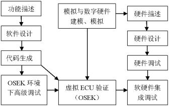 车控电子产品是软硬件结合的嵌入式系统。为了节约资源,缩短产品开发周期,一般应采取软硬件同步开发的方案。车控电子产品的开发工具对软硬件的同步开发、调试提供了很好的支持。车控电子产品的软件开发分为功能描述、软件设计、代码生成、操作系统环境下高级调试等步骤。车控电子产品的硬件开发分为硬件描述、硬件设计、硬件调试等步骤。当软件设计完成后,通过使用相应的工具,完成在虚拟ECU平台上的验证。当硬件设计完成后,与硬件一起进行软硬件集成调试。通过这种开发方式,缩短了产品上市的时间。