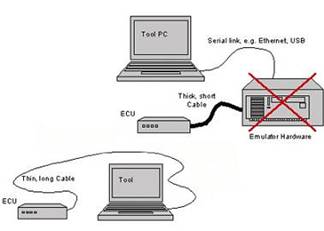 连接仿真系统时的首要问题在于连接长度受到限制,因为系统时钟的速度过高。例如,如果使用一个频率为150MHz的微控制器,那么,50cm长的连接线造成的传输时间延迟大约为2.0ns,但是时钟周期仅为6.67ns,所以2.0ns的单向延误时间是相当巨大的。由于在这些高频率器件中,连接线扮演着传输线的角色,并且它们的终接阻抗是无法得到保障的,因此,这看似短暂的时间几乎妨碍了任何远离目标器件的控制功能。在这个例子中,想要忽略传输线造成的时间上的延迟,线路的最大长度不能超过16cm。所以,在线仿真器(ICE)具有与被测发动机电控单(ECU)相同的环境需求。