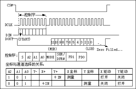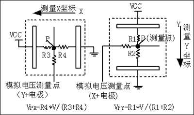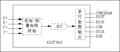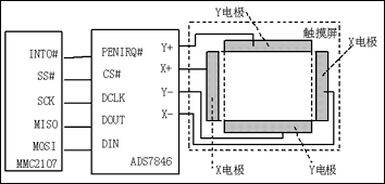 各种类型的触摸屏均有其相应的控制器,如:ADS7846是四线式触摸屏的控制器,而ADS7845是五线式触摸屏的控制器。控制器的主要功能是分时向X、Y电极对施加电压,并把测量电极上的电压信号转换为相应触摸点的X、Y坐标。
