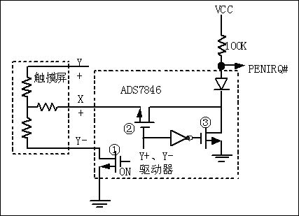 ADS7846通过笔中断请求向MMC2107表示有触摸发生。如图6所示,当没有触摸时,MOSFET①和②打开、③关闭,则笔中断输出引脚通过外加的上拉电阻输出为高。当有触摸时,①和③打开、②关闭,则笔中断输出引脚通过③内部连接到地而输出为低,从而向MMC2107提中断请求。