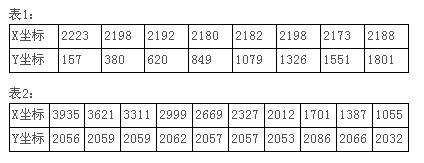 实际测量结果如表1、表2所示: 表1是在一条基本竖直的直线上等距离测量的几个点的坐标值,从表中可得X坐标的斜率为64.25/mm,表2是一条基本水平的直线上等距离测量的几个点的坐标值,可知Y坐标变化斜率为46.33/mm。