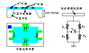 利用压阻效应原理,采用集成工艺技术经过掺杂、扩散,沿单晶硅片上的特定晶向,制成应变电阻,构成惠斯通电桥,利用硅材料的弹性力学特性,在同一硅材料上进行各向异性微加工,就制成了一个集力敏与力电转换检测于一体的扩散硅传感器,如图1所示。