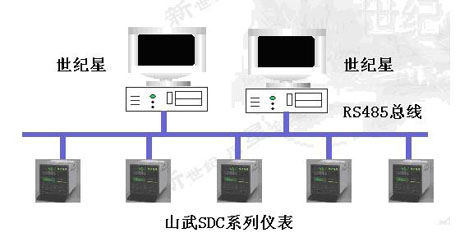 整个系统可分为两层:监控管理层和现场测控层,监控管理层由两台本地节点的上位机组成。现场测控层由采用山武SDC系列仪表组成,三十二台仪表负责现场数据采集和控制。上位机采用《世纪星组态软件》,通过RS485总线从山武SDC系列仪表上获取现场数据,完成对设备监测和控制。