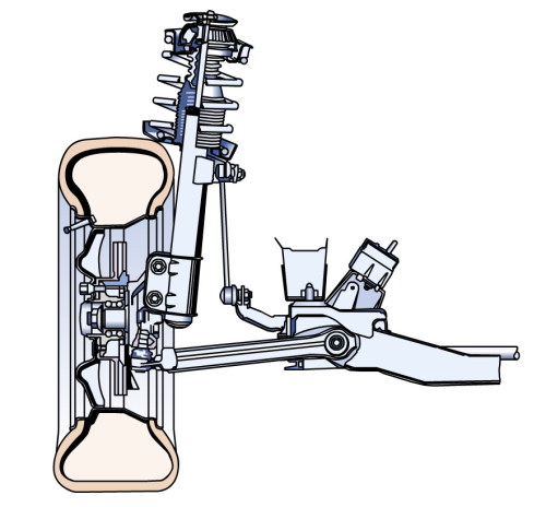 要说麦弗逊式独立悬架在结构上有多简单,从构成部件来看,它仅仅由两大部分构成:支柱式减震器(简称:滑柱)和A字型下托臂。与复杂的多连杆式以及占用空间的横臂式相比,麦弗逊式独立悬架在结构上已经作了最大化精简,并且经过半个多世纪的检验,其结构充分可靠。麦弗逊式独立悬架的物理结构为支柱式减震器兼作主销,承受来自于车身抖动和地面冲击的上下预应力,转向节(也可说车轮,因为转向节作用于车轮)则沿着主销转动;此外,其主销可摆动,特点是主销位置和前轮定位角随车轮的上下跳动而变化,且前轮定位变化小,拥有良好的行驶稳定性。在麦弗逊式独立悬架中,支柱式减震器除具备减震效果外,还要担负起支撑车身的作用,所以它的结构必须紧凑且刚度足够,并且套上螺旋弹簧后还要能减震,而弹簧与减震器一起,构成了一个可以上下运动的滑柱。