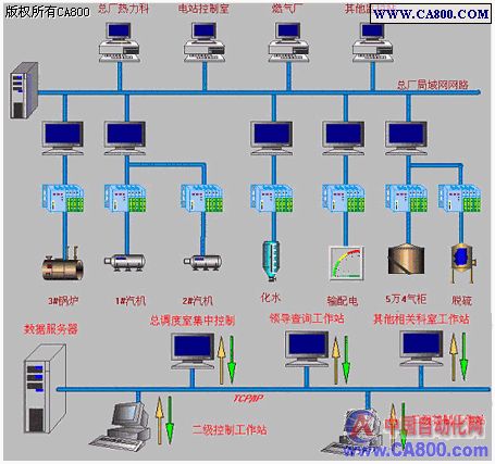 根据实际控制设备实际分布,设立6个监控点,锅炉监控点设工程师站一个及一般监控站一个,其余监控点只设一台上位,以上位机为核心组成一个计算机数据采集监控系统,通过下位机实现数据的采集,它对测量数据的处理以及控制算法都是以数字计算为基础,通过软件实现。硬件由上位机﹑下位机、一次仪表﹑及执行器等部件组成。