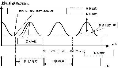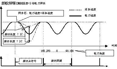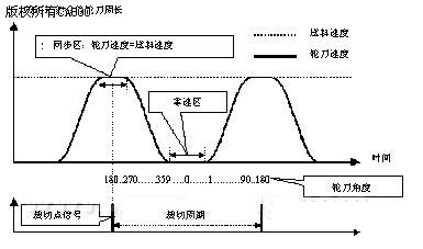 系统组成及其功能介绍: 1、旋转式同步飞剪控制驱动系统(VEC-VBR): 接受PLC及HMI输入的运转命令及长度设定 侦测量测轮编码器传回之脉冲,得知进料速度及进料长度。 控制伺服马达之运转速度及同步定位动作 2、人机界面(HMI): 接受设定资料及显示运转状态 3、PLC: 处理基本之接口、互锁、连动信号 4、永磁同步伺服马达 或 感应式伺服马达: 将马达动力传送至上下裁切刀轮 5、轮刀: 上下镜射、各带刀刃的一组回转机构 6、送料检测编码器: 直接紧密的接触待切材料,靠材料之横移而带动编码器产生脉冲信号 三、工作原理 电脑横切机切纸板时,切刀运行的速度曲线因裁切长度的不同而不同,大体分三种情况:裁切长度大于两倍切刀圆周长、裁切长度大于切刀圆周长且小于两倍切刀圆周长、裁切长度小于切刀圆周长。 第一种情况:裁切长度大于两倍切刀圆周长 图2: 裁切长度大于两倍切刀圆周长的运转曲线 如果裁切长度大于两倍切刀圆周长,运行速度曲线如图2所示;整个裁切循环从第一个裁切点开始到第二个裁切点结束,重点分段说明如下: 1. VEC-VBR控制系统随时监控进料长度与进料速度并控制伺服马达带动裁切刀轮,掌握正确的裁刀速度曲线。 2. 从第一个裁切点开始 (裁刀方位角等于180度),当时仍然在同步区域内,因此裁刀速度必须与进料速度维持同步运转。 3. 当裁切刀」离开同步区域后,裁刀速度曲线经过控制系统精确的计算、控制,在降低到零速的同时,裁刀方位角也必须刚好等于0度。 4. 当进料长度累计到适当长度时,裁切刀轮开始朝进料速度目标加速;而且裁刀速度曲线经过控制系统精确的计算、控制,务求在裁刀速度上升到与进料速度同步的同时,裁切刀轮也恰好进入同步区域。 6. 进入同步区域之后,裁刀速度必须随时与进料速度维持同步运转,直到第二个裁切点出现,乃完成一次裁切循环