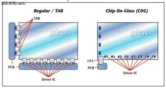 COG是英文Chip On Glass 的缩写,即芯片被直接邦定在玻璃上(图1)。这种安装方式可大大减小整个 LCD 模块的体积,且易于大批量生产,适用于消费类电子产品用的 LCD,如手机、PDA 等便携式电子产品。这种安装方式在 IC 生产商的推动下,将会是今后IC与LCD的主要连接方式。