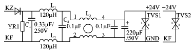 图5中,KZ、KF外接24 V直流电源;YR1为压敏电阻器,VmA=1.5×24 = 36 V,用于抗浪涌冲击;L1、L2、C1和C2构成平衡型LC滤波器,抑制差模干扰;L3为共模电感,用于抑制共模干扰;TVS1用于抑制电快速瞬变脉冲群干扰。注意,如果GND不能通过机壳接地,则必须要加TVS2接KF,目的是把瞬变脉冲干扰信号“导”向大地。