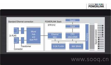 这种微控制器单元结合了一个32位ARM9 CPU, 一个96 KB SRAM,一个容量在512 KB 和2.1 MB之间的闪存、一个以太网控制器和一个实时时钟。此方案可确保响应时间低于5µs。Port公司的堆栈和ST公司的硬件使用户只需添加很少的元器件即可实现一个POWERLINK连接,这样总成本会低于基于ASIC解决方案的成本。如果MCU带一个更大的闪存,用户也能实施多协议设计,这样就能连接到所有基于软件的协议例如Ethernet/IP、Modbus TCP 或Profinet IO 和 RT。要适应CANopen 和 DeviceNet网络解决方案,用户只需连接一个CANopen收发器即可实现。Port公司还为制造商提供产品研发支持,如:一种能够快速编译对象字典和输出EDS文件的设计工具、一种包括研发协议和应用实例需要的所有组件的开发套具和测量精确时间的分析器。另外,此方案伴随一系列的帮助工具:比如JTAG-capable硬件,以确保有效的调试。而且,制造商可以使用免费的GCC编译器(GNU complier collection)。