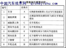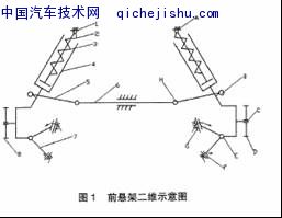 在建立这个模型前,必须先对悬架系统进行合理简化。从汽车动力学的角度出发,有人提出如下假设。假设一:前悬架系统各个刚体(车轮除外)相对于整车而言,其质量是微不足道的,在建模过程中可以忽略不计。这样前悬架系统每个刚体在各个方向的惯性力均为零。由于每个刚体具有位移和速度,因而称其为悬架准动力学模型。假设二:由于某些铰链在一些方向的力的约束真值比较小,对整车动力学的影响可以忽略不计,也假设其为零。例如球铰在三个方面的力矩约束均为零。由于将悬架系统视为无质量的传力杆系机构,因而计算出的各刚体的内力和内力矩更接近实际状况,并可以将仿真工况扩大到极限运动和危险运动等大运动范围的仿真。